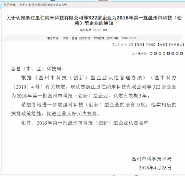 日前,按照《溫州市科技(創(chuàng)新)型企業(yè)認(rèn)定管理辦法》有關(guān)規(guī)定,由鹿城區(qū)科技局推薦,通過專家評審,我公司被認(rèn)定為2016年第一批溫州市科技(創(chuàng)新)型企業(yè)。